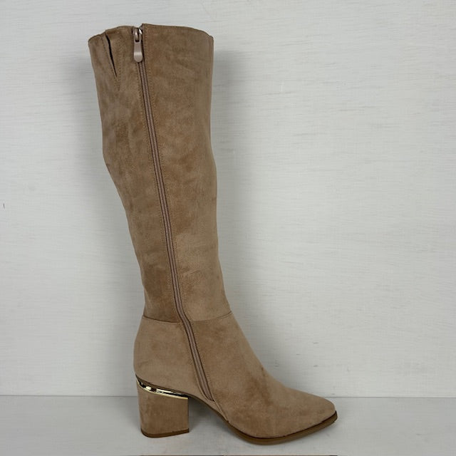 Wat een leuke laarzen! De laarzen zijn gemaakt van suèdine en zijn leuk afgewerkt met een elegante hak met een gouden randje. Ze vallen op maat en hebben een rits aan de binnenkant voor de eenvoudige instap.