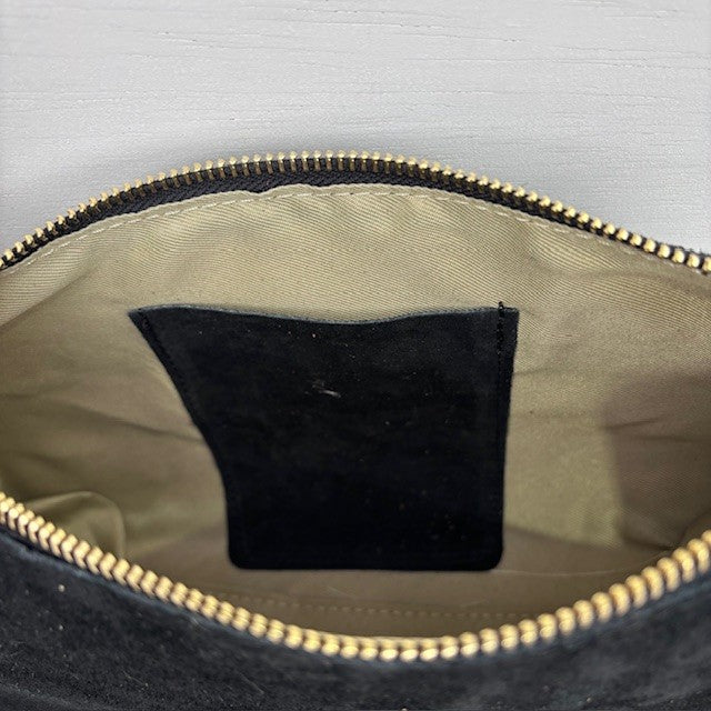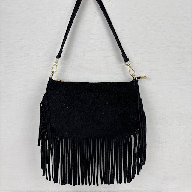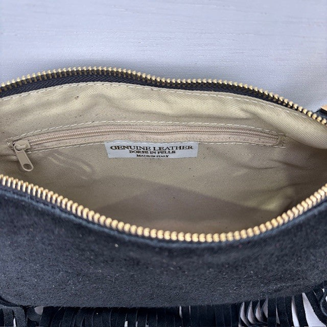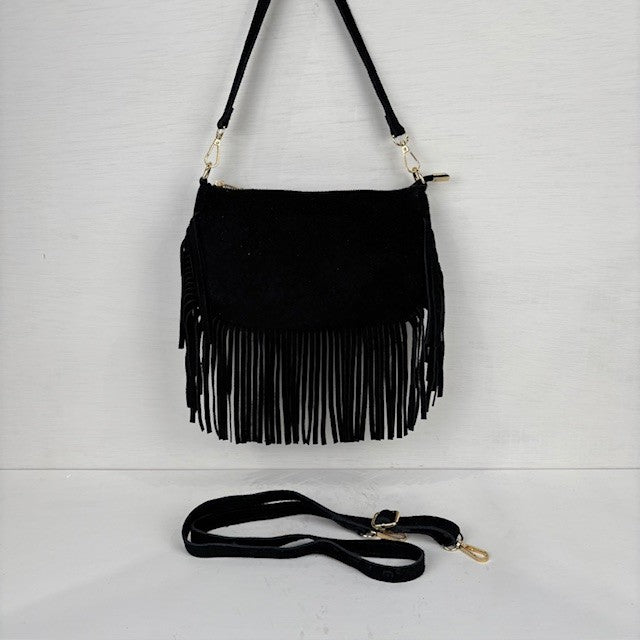 Wauw wat een geweldige tas! De tas is afsluitbaar met rits en heeft binnenin nog een extra ritsvakje + steekvakje. De tas wordt geleverd met een kort en een lang hengsel. Helemaal trending op dit moment zijn franjes. Super leuk te combineren met geweldige laarzen. Tasje is gemaakt van 100% leer (suede).