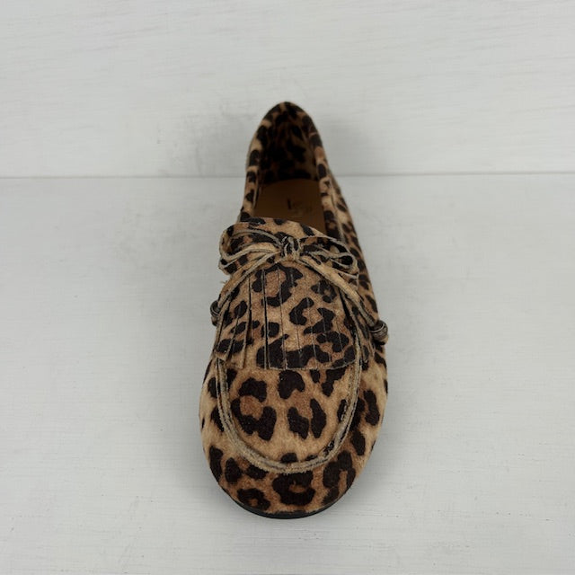 Suèdine instappers met franjes panter