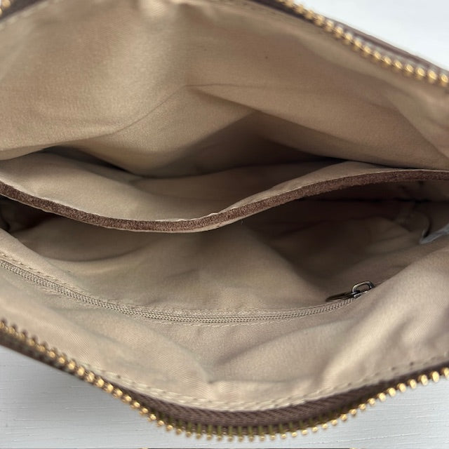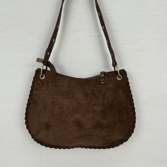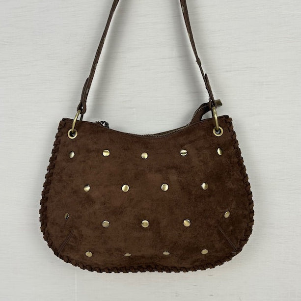 Wat een geweldig schoudertasje van suèdine! Het tasje is leuk afgewerkt met studs en wordt geleverd met een extra verstelbare band zodat je hem op verschillende manieren kunt dragen. Verder heeft het tasje binnenin twee grote vakken en een klein vakje met rits.