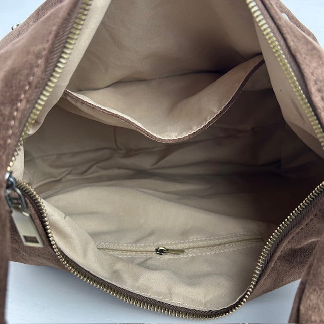 Wat een superleuke schoudertas! De tas is gemaakt van suèdine en afgewerkt met trendy studs. De tas heeft naast een groot vak met ritssluiting ook nog twee kleine vakjes binnenin waarvan één met ritssluiting. Hij wordt geleverd met een extra verstelbare band waardoor je de tas ook om kunt hangen.