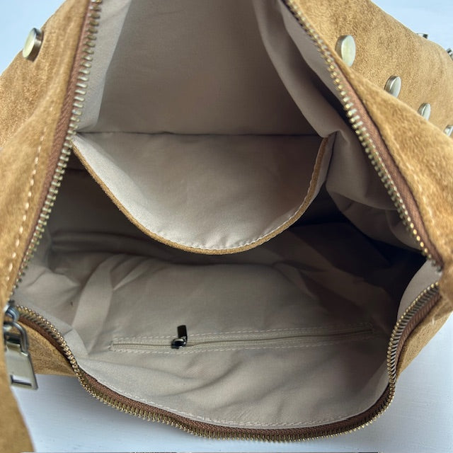 Wat een superleuke schoudertas! De tas is gemaakt van suèdine en afgewerkt met trendy studs. De tas heeft naast een groot vak met ritssluiting ook nog twee kleine vakjes binnenin waarvan één met ritssluiting. Hij wordt geleverd met een extra verstelbare band waardoor je de tas ook om kunt hangen.